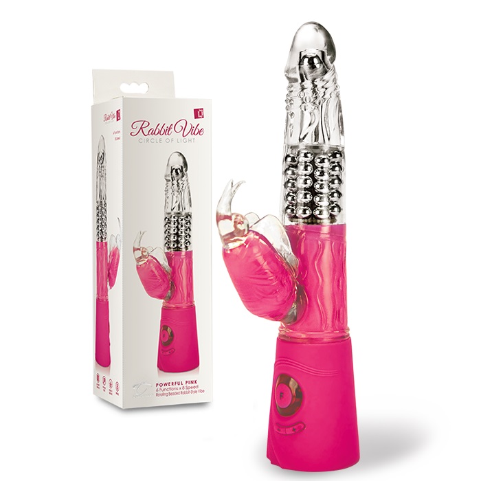 Розовый вибромассажер с клиторальным стимулятором Rabbit Vibe Circle of Light Powerful - 26 см.