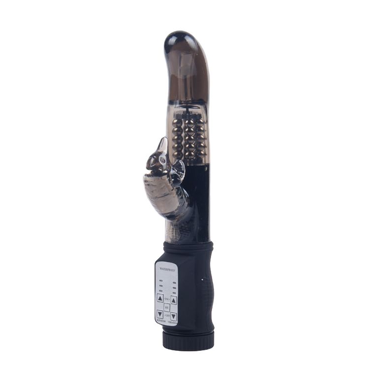 Дымчатый вибратор с изогнутой головкой, ротацией и клиторальным отростком - 22 см.