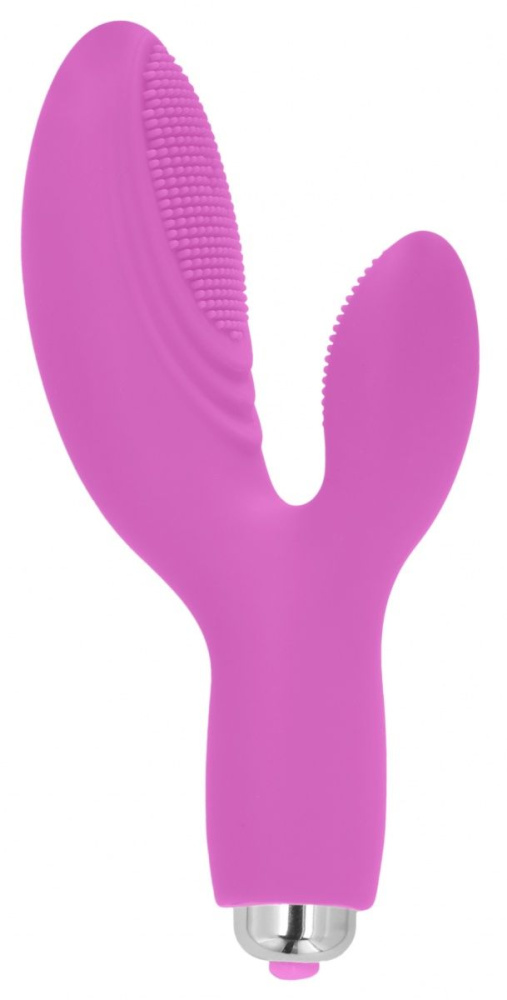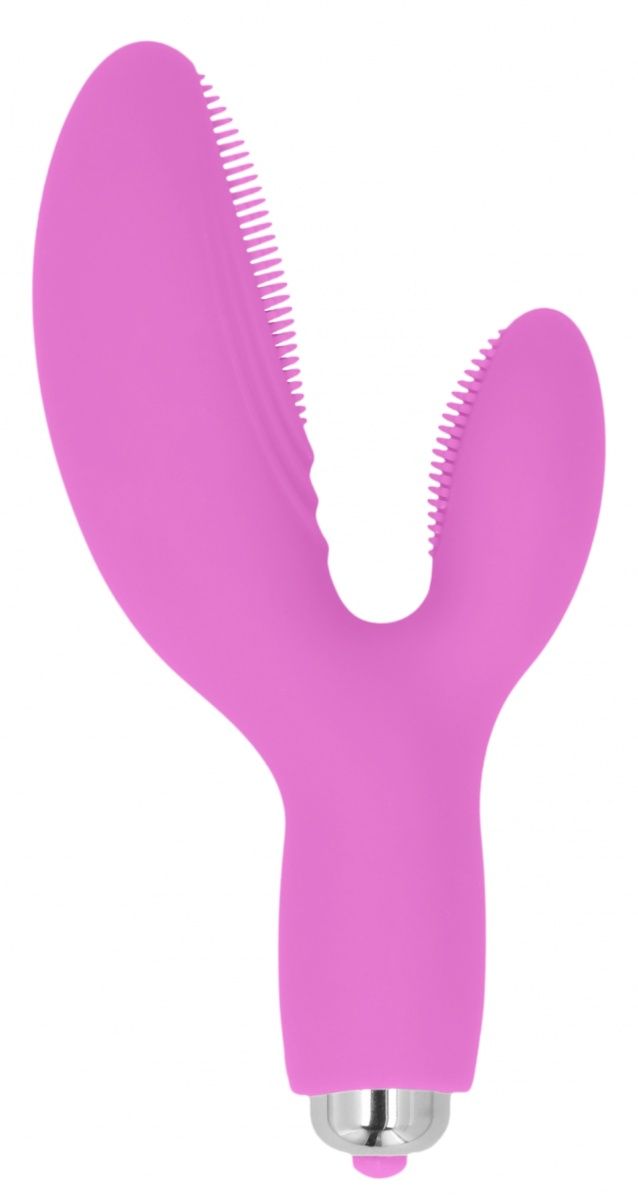 Силиконовый вибратор c клиторальным отростком. Имеет 10 режимов вибрации, лёгкое управление при помощи кнопки в основании игрушки. Главное достоинство данного вибратора кроется в мягких усиках. Рабочая длина - 7,5 см.