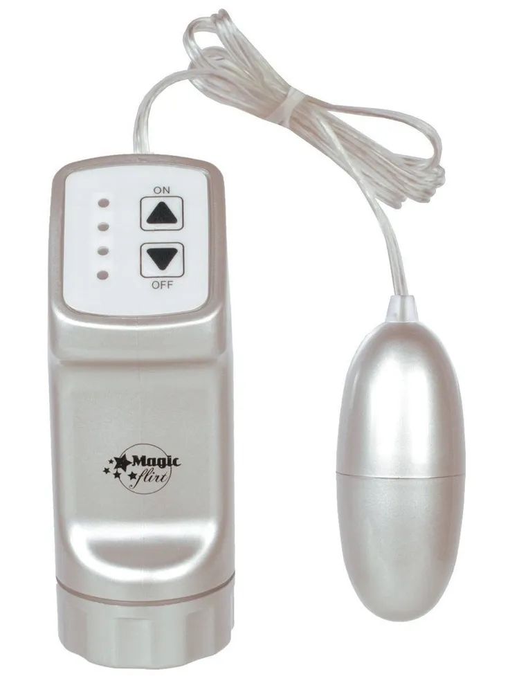 Серебристое виброяйцо с пультом управления на проводе. Подходит для клиторальной стимуляции, массажа эрогенных зон, вагинального введения. Имеет 4 режима работы.